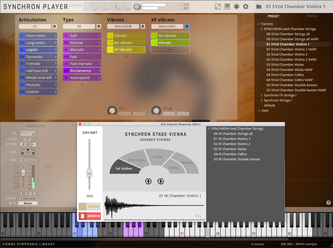 本ライブラリのためにVSL の開発チームは、「VIENNA MIR PRO」から派生した特別なコンボリューションエンジンをSYNCHRON PLAYER に追加搭載しました。Synchron Stage Vienna の540㎡(5,813 sq.ft.)のメインホールの優れたアンビエンスをSYNCHRON PLAYER の中で活用することができます。またカスタムのインパルスレスポンスと各ストリングスセクション用に制作されたリバーブ設定によって、リアルなリバーブ感と演奏ポジションを即座に得ることができます。VSL のサンプリング専用スタジオ「Silent Stage」で収録されたドライなサンプルにSynchron Stage Vienna のステージA のアンビエンスを加えたことで、本ライブラリは他のSynchron シリーズと完全にマッチし、制作で使えるサウンドを即座に提供します。