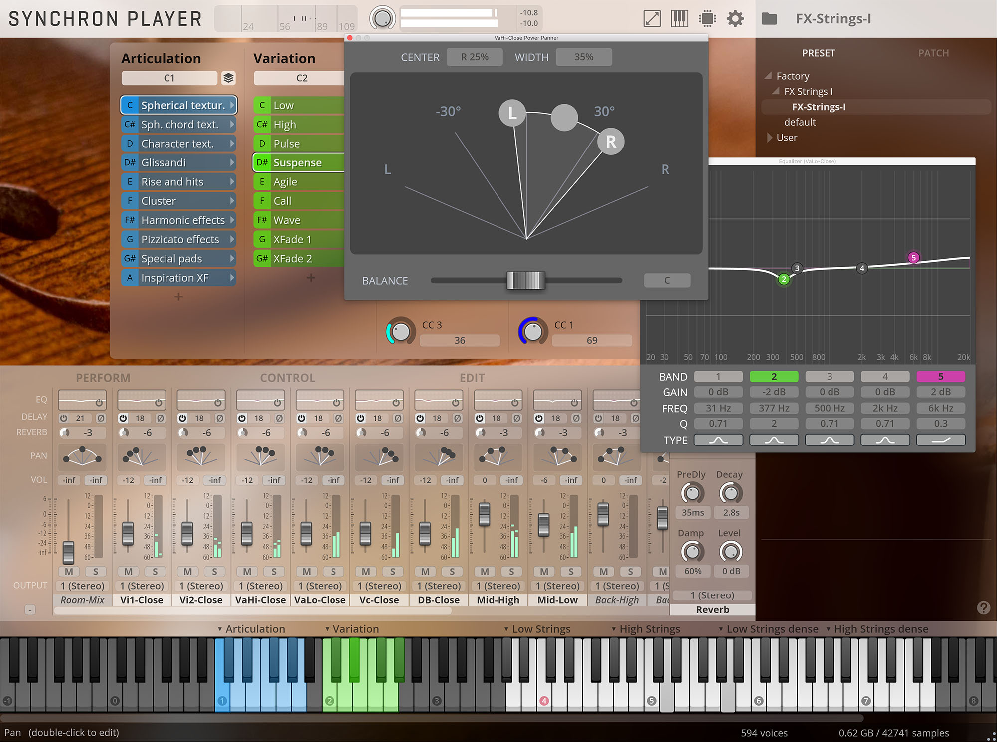 「Silent Stage」で収録されたドライなサンプルをSYNCHRON PLAYER で使用できるようにするために、VSL のサウンドエディターチームは「SYNCHRON STRINGS 1」との完全な互換性を達成するために最大限の注意を払いながらエディット作業を行いました。これによって様々なアーティキュレーション間がスムーズに切り替えられるようになった他、ノンヴィブラート~ヴィブラートへシームレスに移動できるようになりました。その結果、本ライブラリと「SYNCHRON STRINGS 1」のレイヤーはもちろんのこと、「SYNCHRON STRINGS 1」で制作したものを本ライブラリに置き換えたり、またその逆が容易になりました。