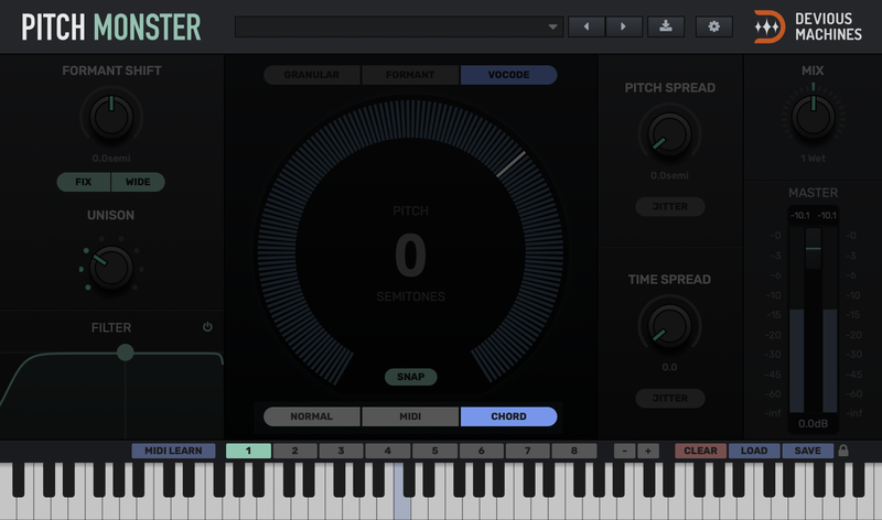 リアルタイムのMIDIコントロール、低レイテンシー、8ボイスのポリフォニーにより、楽器のように演奏することができます。ピッチとタイムのランダマイズは普通の音を幻想的な音に変え、極端なフォルマントシフトは声の性別を変えるだけでなく、まったく別のサウンドにに変異させることができます。
