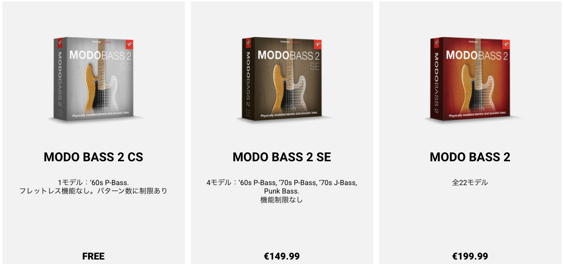 発売日は不明ですが近日中の発売が予定されていてメーカー公式HPでは予約受付が始まっています。無料版のMODO BASS 2 CS(!)を含む3種類のグレードと1つのバンドルの合計4種類のラインナップで価格は199.99ユーロからとなっています。